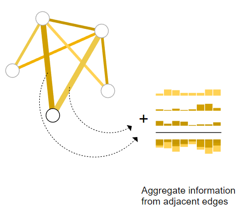 当我们考虑一个节点及其1度相邻节点的和聚合时,我们也可以考虑使用加权和
